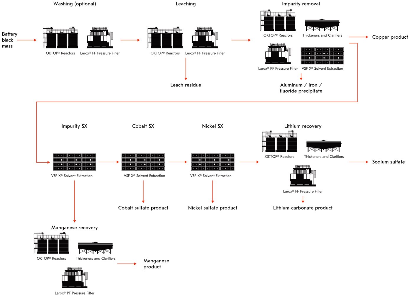 The Battery black mass recycling process - Opens in a new window treats batteries after mechanical separation and optional thermal treatment for the recovery of nickel, cobalt and lithium, as well as optionally manganese and copper. The process flowsheet can also be tailored according to the feed materials and desired end products with possible phased approach, starting with recovering the most valuable metals.