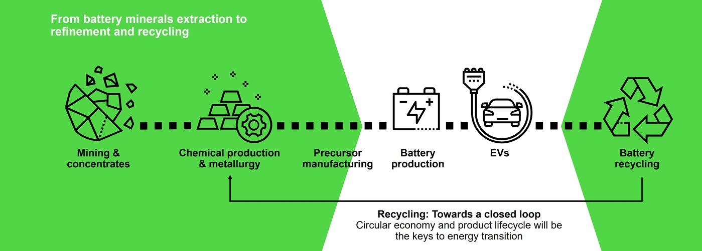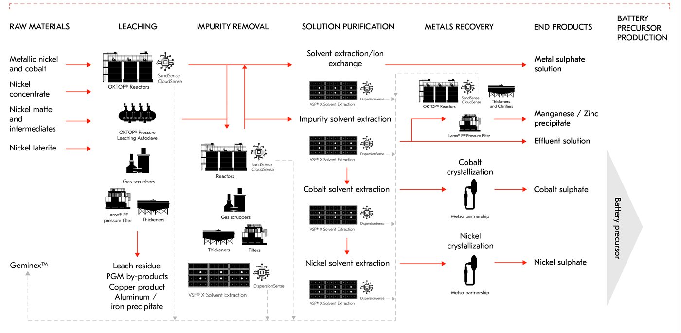 Metso can now offer complete processes for the battery minerals production from minerals extraction to refined battery chemicals and end-of-life battery black mass recycling.