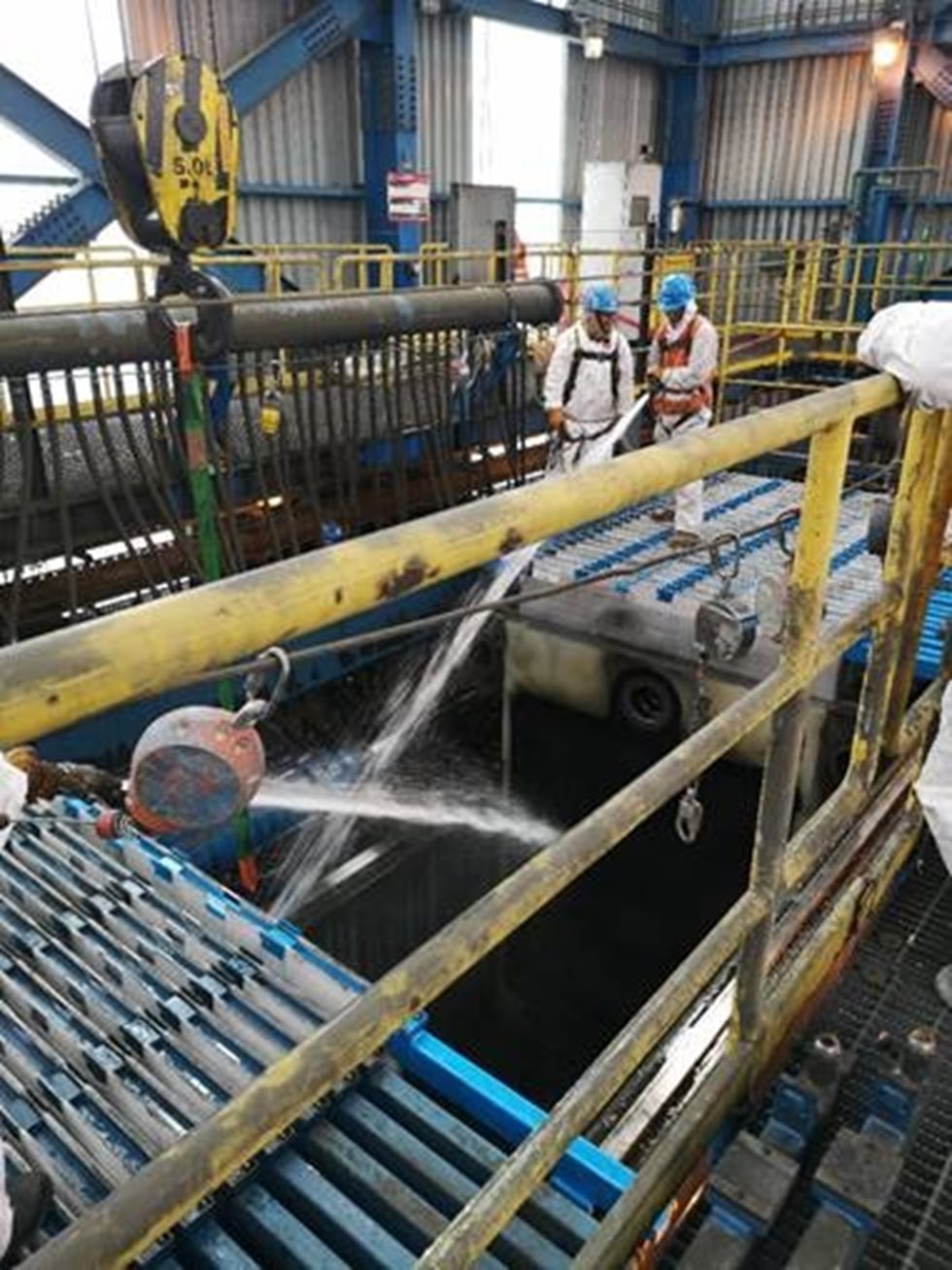 5. Lave las tuberías. Vacíe y lave todas las tuberías a excepción de las hidráulicas (agua, aire, lodo) y drene todo el líquido que se encuentra en el sistema.