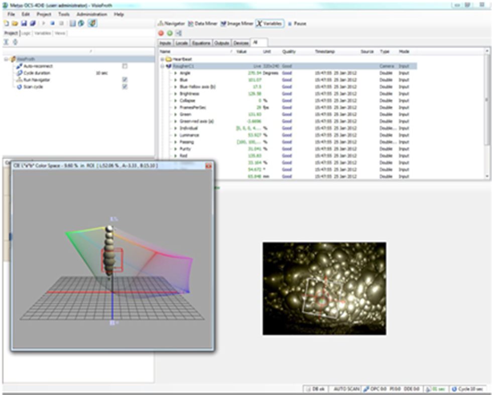 El sistema mide la velocidad de descarga (medición precisa a través de imágenes 2D), distribución del tamaño de las burbujas (basada en mediciones directas), color (identificado por algoritmos mediante los cuales se tiene una detección temprana de anomalías en el color de la espuma), estabilidad, textura (derivada de la teoría fractal), entre otros parámetros.