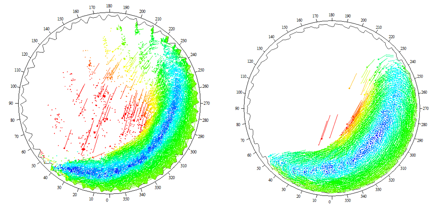 Estas herramientas, además de entregarnos información valiosa relacionada con la duración y vida util de los revestimientos, nos permite estimar aproximadamente cual será el mecanismo principal de molienda según el diseño de revestimientos: tendremos una molienda más relacionada con el impacto o con la abrasión. La visualización del movimiento de carga interna nos puede dar ya indicios del mecanismo principal de molienda para el molino.