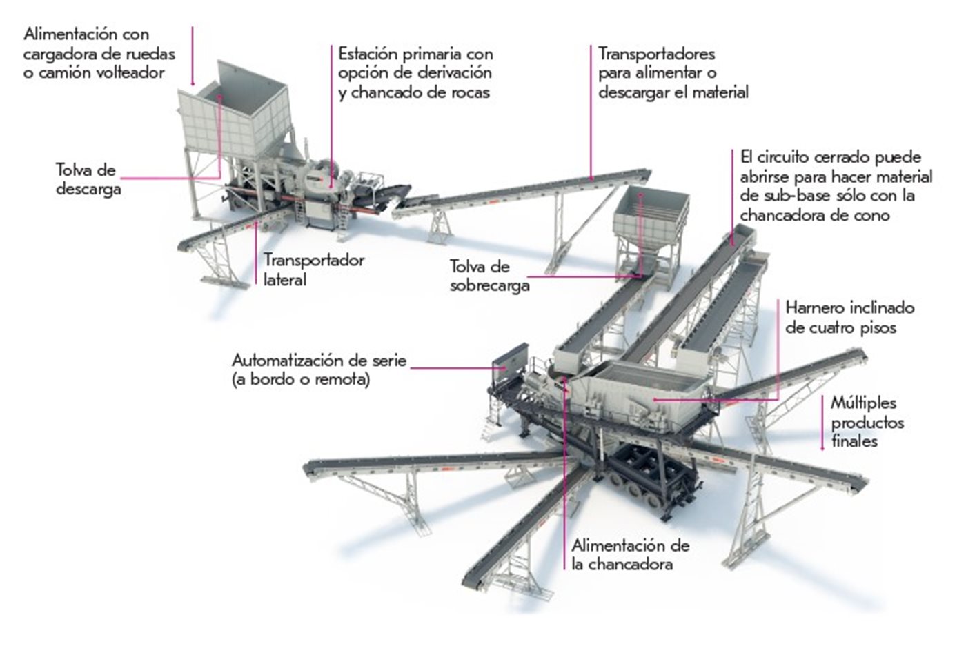 NW Rapid proporciona esquemas de planta prediseñados y diagramas de flujo de procesos para una amplia gama de aplicaciones de áridos y capacidades de producción. La planta portátil está diseñada con estaciones de trituración primaria, secundaria y terciaria que incluyen trituradoras portátiles, alimentadores y cintas transportadoras, todo ello diseñado para encajar a la perfección.