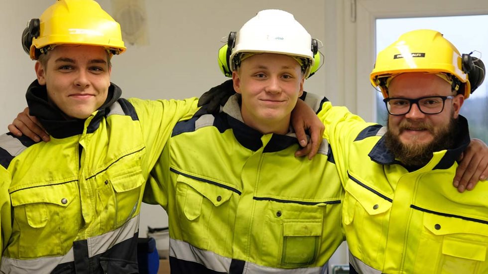 Lehtorit Janne Hietala ja Asmo Kuruaho valvovat oppilastyötä tarkasti valvomokontissa ja antavat ohjeita radiopuhelimella. Välillä miehitystä koneissa vaihdetaan. Päivän lopussa valmista opinnäytettä on kasalla noin 1000 tonnin verran.