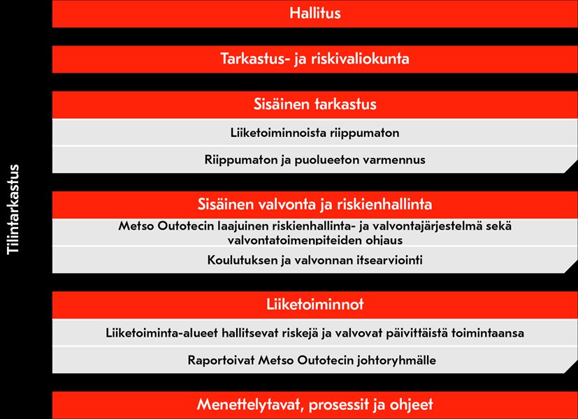 Vuonna 2024 suoritettiin yhteensä 20 sisäistä tarkastusta, jotka koskivat määriteltyjä keskeisiä liiketoimintaprosesseja, sisäisen valvonnan ympäristöä määritellyissä Metson yksiköissä ja markkina-alueilla sekä konsernitason riskiteemoja, kuten tietoturvaa, työterveyttä ja työturvallisuutta, sekä määriteltyjä vaatimustenmukaisuuteen liittyviä aiheita. Sisäisen tarkastuksen muita toimia vuonna 2024 olivat toiminnanohjausjärjestelmä-projektin tukeminen sisäisen valvontaan liittyvissä asioissa, vaatimustenmukaisuustiimin tukeminen Whistleblower- ja muissa tutkinnoissa sekä organisaation avustaminen vastuullisuudessa, kuten vastuullisuuden selvitysprosessien sisäisen valvonnan kehittämisessä.