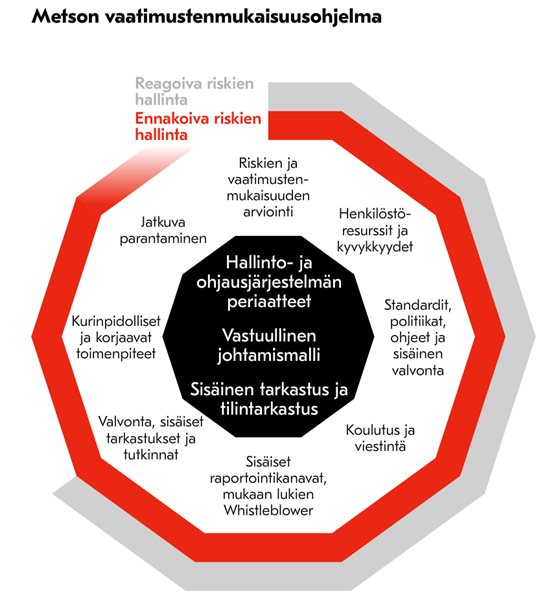 maksettavan korvauksen osalta noudatetaan sovellettavia paikallisia lakeja ja säädöksiä. Lahjontaan ja korruptioon sovelletaan nollatoleranssia Metson korruptionvastaisen menettelytavan mukaisesti. Vaatimuksenmukaisuus on Metsolla kaikkien työntekijöiden vastuulla ja toimintaperiaatteiden noudattamisen varmistamiseksi on käytössä erilaisia sisäisiä valvontatapoja. Metso vaatii kolmansien osapuolten kanssa tekemissään sopimuksissa, että myös toimittajat, liikekumppanit ja muut sidosryhmät noudattavat vastaavia periaatteita toiminnassaan.
