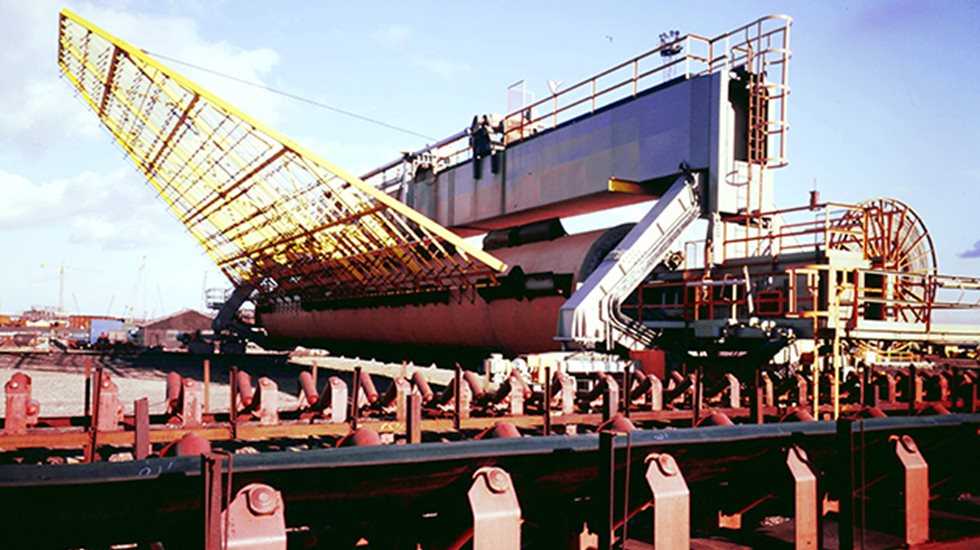 A barrel reclaimer comprises of a bridge spanning the stockpile which is supported on “A” frames at each side, these are carried on motor-driven bogies which run on rails laid on each side of the pile. The heart of the machine is a rotating barrel supported from the main structure. This barrel is fitted with a large number of reclaiming buckets arranged along its length and around it circumference, which pick up the material that has been fed to the base of the pile by means of a harrow which traverses across the pile face. The oscillating rake system disturbs the material in the stockpile across its entire width causing it to slide down the slope of the stockpile into the path of the rotating buckets.