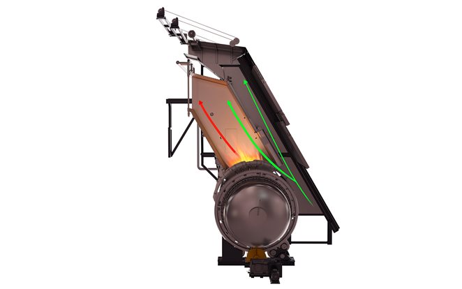 The overall ingress airflow into the Primary Converter Hood enters under the front sliding door during blowing. The closed back-flap and tight fitting of the Primary Converter Hood to the converter mouth control the flow of ingress air, improving process gas quality in terms of SO2 concentration.