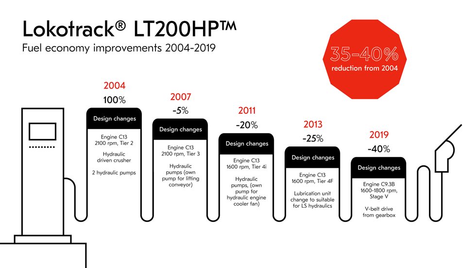 The fuel economy of the Lokotrack® LT200HP™ has improved by between 35 and 40% since the first model was introduced in 2004. The latest model can save at least 15% in fuel consumption compared to the previous hydraulic-driven model, thanks to its direct belt drive from the gearbox. It is also the first Lokotrack to comply with Stage V emission regulations.