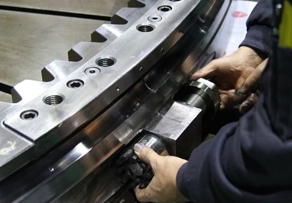 The geared slewing bearing is the connecting element between the static column and the rake cage of the mechanism delivering torques of up to 14,500,000 Nm.