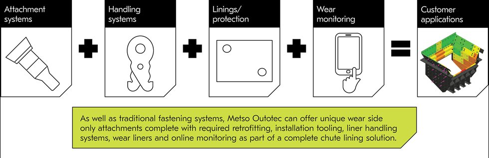 Metso XLOK™ is a tough modular liner system and the ultimate choice for situations where equipment can only be accessed from the inside or where a single-sided bolting system provides maintenance savings. XLOK™ delivers consistent liner position on all four sides with no guesswork or measuring to install as the backplate automatically spaces the liners.