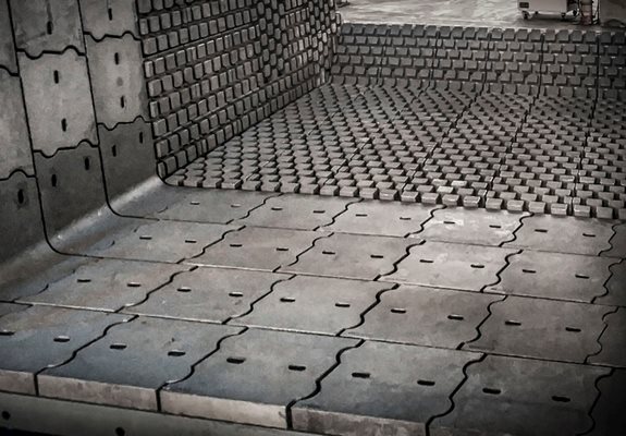 The direct impact can be reduced and controlled by incorporating Metso Rockbox liners into the equipment. Rockbox liners are designed to provide increased liner wear life by reducing the surface area of the liner exposed to wear. The liners' raised blocks and ribs retain some of the product, promoting rock-on-rock wear to protect the liner and maximize liner life. Rockbox liners can be bolted into a chute to easily replace standard flat liners in harsh applications.
