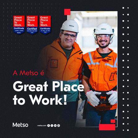 Estamos felizes em compartilhar que recebemos a certificação Great Place to Work (GPTW) nas operações da Metso no Brasil, Chile e Peru. Reconhecida globalmente, essa certificação é concedida a empresas que se destacam pela qualidade de seu ambiente de trabalho, com base em uma rigorosa avaliação com as pessoas, sobre fatores como confiança, respeito, credibilidade e inclusão.