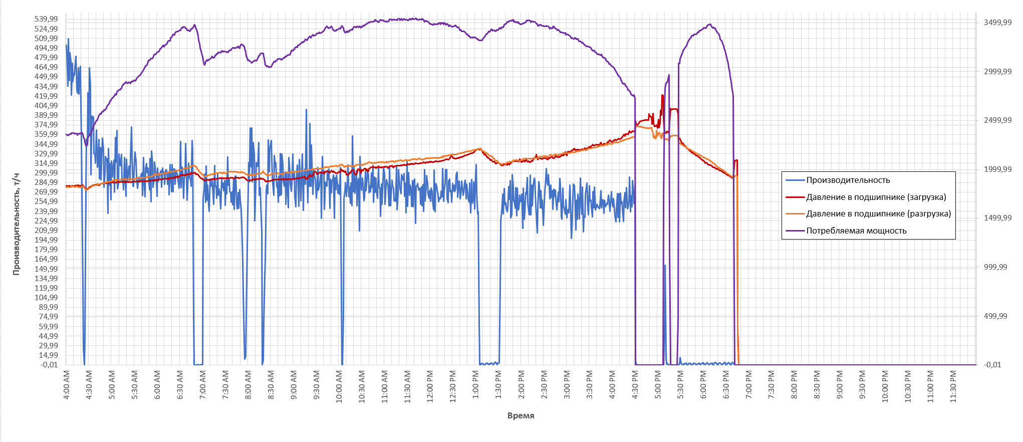 Давление в подшипниках мельницы (то есть противодавление гидростатической системы смазки) считают критическим показателем при эксплуатации мельниц ПСИ/СИ, который требует особого внимания. Важно как можно раньше обнаружить изменение общего уровня заполнения барабана мельницы. Индикаторами изменений, связанных с вращением мельницы, могут служить как питание, так и механическое состояние мельницы. Если питание и механические изменения отфильтрованы правильно, реальное изменение давления в подшипнике определяется достаточно точно. Поскольку давление в подшипнике чувствительно к температуре и качеству масла (вязкости), необходимо учитывать смещение показаний датчиков.
